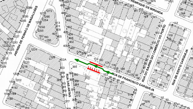 Pelo mesmo motivo e período, tornou-se necessário manter a proibição da paragem e do estacionamento em ambos os lados da Rua de Francisco Carqueja, junto à Rua das Antas, numa extensão aproximadamente de 10 metros e conforme sinalização estabelecida no local.