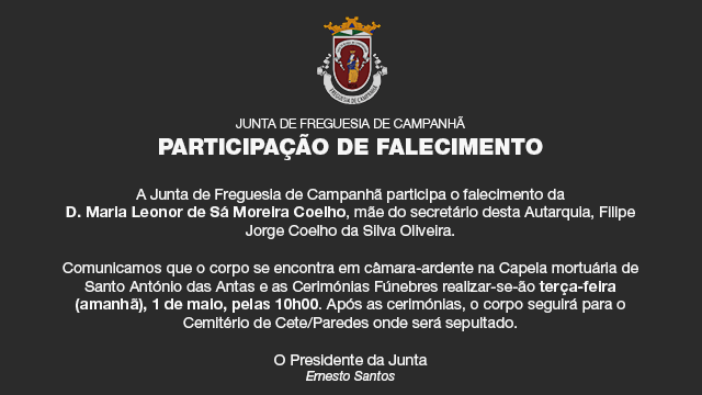 Comunicamos que o corpo se encontra em câmara-ardente na Capela mortuária de Santo António das Antas e as Cerimónias Fúnebres realizar-se-ão terça-feira (amanhã), 1 de maio, pelas 10h00. Após as cerimónias, o corpo seguirá para o Cemitério de Cete/Paredes onde será sepultado.
