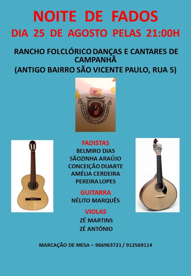 O Rancho Folclórico Danças e Cantares de Campanhã vai realizar uma noite de FADOS, sábado dia 25 de agosto (sábado) pelas 21 horas e gostaríamos de contar com a presença de todos.