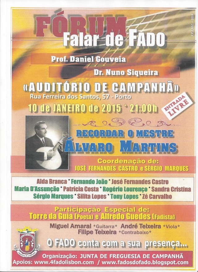 FALAR DO FADO - FORUM Silêncio! Que se vai "FALAR DO FADO" No dia 10 de Janeiro, às 21h00, no Auditório da Freguesia de Campanhã vai realizar-se um colóquio sobre este símbolo da nossa Cultura, recentemente elevado a Património Imaterial da Humanidade. Entrada Gratuita. CANTAR AS JANEIRAS < Anterior Livro "Porto que foi e ainda é" de António Amen Seguinte >