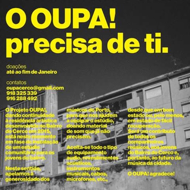 Para isto poder acontecer fazemos este apelo aos músicos do Porto e a todos que possam contribuir com material usado e que já não precisem (equipamento áudio, revestimentos acústicos, instrumentos musicais, cabos, microfones, etc).