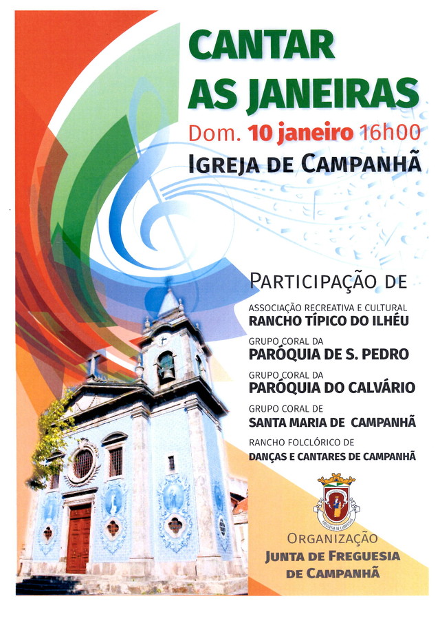 O Executivo da Junta de Freguesia de Campanhã e o Pároco Cónego Fernando Milheiro, convidam V.Exª a assistir ao cantar das Janeiras , que se realizará no próximo domingo - dia 10/01 - pelas 16h00 na Igreja Paroquial de Nossa Senhora de Campanhã, conforme cartaz anexo.