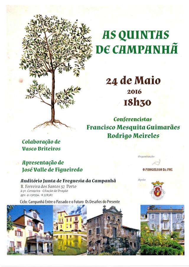 No dia 24 de Maio, às 18h30, no Auditório da Freguesia vai decorrer mais uma Conferência sob o tema "AS QUINTAS DE CAMPANHÃ ", no âmbito do ciclo de conferências, Campanhã entre o Passado e o Futuro - Os Desafios do Presente.