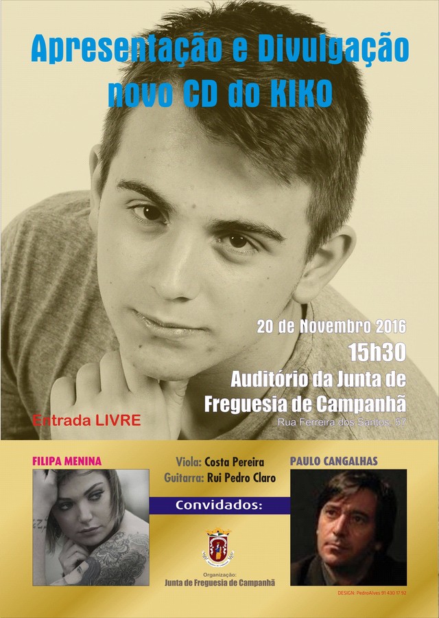 O auditório da Junta de Freguesia de Campanhã, vai ser palco de uma grande tarde de Fados, no dia 20 de novembro, a partir das 15h30. Como cabeça de cartaz vamos ter o fadista Francisco Moreira, com o nome artístico (KIKO), também vão actuar os fadistas Filipa Menina e Paulo Cangalhas. Kiko começou a cantar aos 7anos tendo sido vencedor, com 11 anos, do primeiro Concurso de Fado da RTP 1. Esteve em algumas das mais bem conceituadas salas do país como o Casino do Estoril, a Casa da Música no Porto, no Coliseu do Porto, participou ainda no Caixa Alfama e no Caixa Ribeira. Actualmente com 16 anos, está a lançar o seu segundo CD de fado, este com produçao do conceitoado fadista Helder Moutinho e presença assídua nas Casas de Fado em Lisboa assim como na cidade do Porto e outras zonas do país.