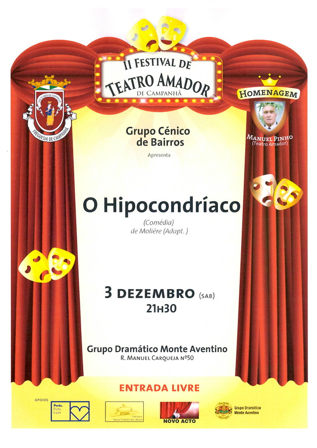 SESSÃO DE TEATRO - O HIPOCONDRÍACO No próximo dia 03 de Dezembro, às 21h30, o Grupo Dramático do Monte Aventino vai receber a peça "O HIPOCONDRÍACO". No Mira - Quinta Nómada - YERG de João Dias < Anterior APRESENTAÇÃO DE LIVRO EM HOMENAGEM AO CONDE FERREIRA Seguinte >