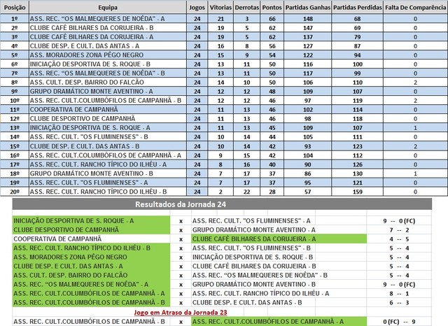 A 24a Jornada do Campeonato de Bilhar /Snooker Inter Associações de Campanhã foi muito disputada, continuam a lutar pelo primeiro lugar às equipas (em 1o ) Associação Recreativa "Malmequeres de Noeda " - A e o Clube Café Bilhares da Corujeira - B (em 2o) apenas separados por um ponto.