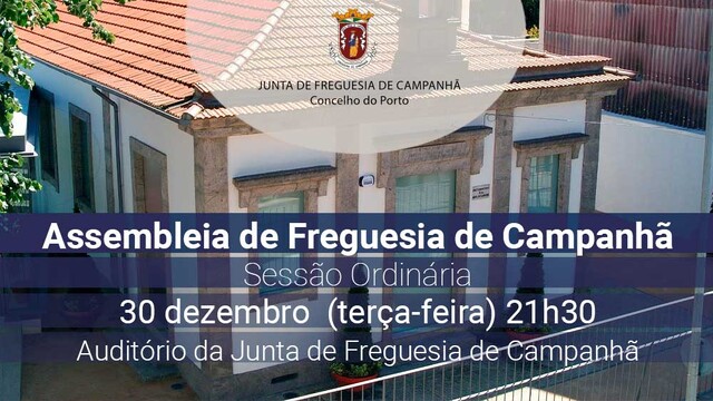 FAZ PÚBLICO que, em conformidade com a competência que lhe confere a, Alínea b) do n.º 1 do Artigo 14º. da Lei 75/2013 de 12 de setembro, a Assembleia de Freguesia de Campanhã vai realizar a Sessão Ordinária no próximo dia 30 de DEZEMBRO (terça-feira), com início às21H30 no Auditório da Freguesia de Campanhã, sito à Rua Ferreira dos Santos, 57, com a seguinte ordem de trabalhos: