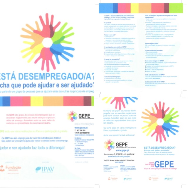 Para quem desconhece, os GEPE são grupos informais de pessoas desempregadas que se reúnem semanalmente, com o apoio de facilitadores/dinamizadores, e se focam na procura ativa de emprego para os seus membros. Trata-se de um projeto que já é desenvolvido por várias entidades, e em vários pontos do país, há cerca de 4 anos. Para mais informação, podem obter no cartaz da noticia ou consultar www.gepe.pt.