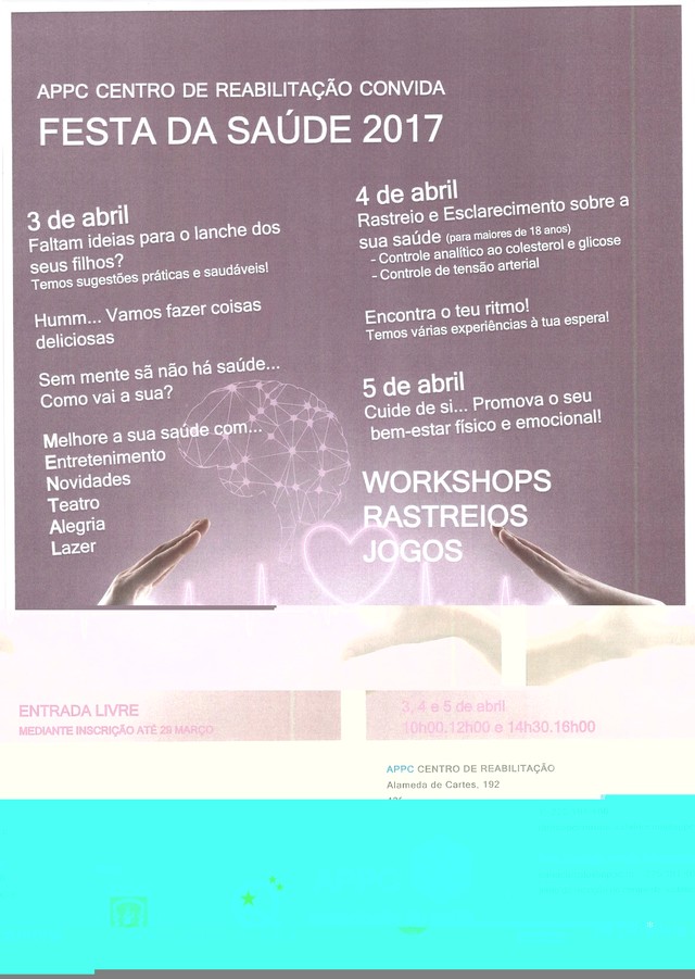A APPC vai realizar um evento sob o tema Saúde, com o apoio da Junta de Freguesia de Campanhã. O evento vai decorrer nos dias 3, 4 e 5 de Abril com actividades diversas (ver cartaz ), dívidas em Workshops, Rastreios e Jogos. A entrada é livre, no entanto, sujeita a inscrição que decorre até 28 de Março.