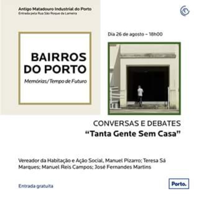 Amanhã, dia 26 de Agosto, a partir das 18h, debate-se e conversa-se sobre um tema doloroso e que abrange muita gente na nossa cidade, incluindo a freguesia de Campanhã - "Tanta Gente sem casa". Estão todos convidados a comparecer no auditório do antigo Matadouro Industrial do Porto, na rua de São Roque da Lameira, à Praça da Corujeira. Estão convidados para o debate e responder às perguntas do público, o sr. Vereador da Habitação e da Acção Social, Manuel Pizarro, Teresa Sá Marques, Manuel Reis Campos e José Fernandes Martins.