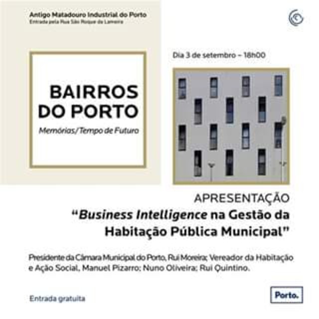 Hoje, às 18h, no antigo Matadouro Industrial do Porto, onde vai estar presente o presidente da Câmara do Porto, Rui Moreira, vereador da habitação e acção social, Manuel Pizarro, Nuno Oliveira e Rui Quintino, para apresentação de um novo sistema "Business Inteligece na Gestão da Habitação Pública Municipal".