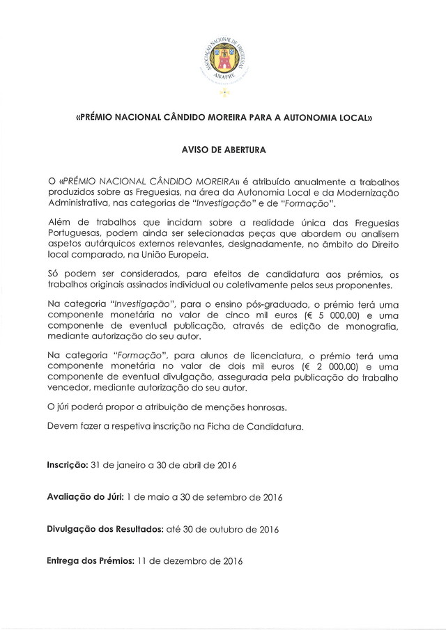 Procurando assinalar os 40 anos das primeiras Eleições Livres e Democráticas para as Autarquias Locais, a ANAFRE (Associação Nacional de Freguesias), em homenagem ao anterior Presidente, instituiu o «Prémio Nacional Cândido Moreira para a Autonomia Local».   Além de procurar reforçar e estimular os valores societários das Autarquias Locais, nomeadamente, das Freguesias, na implantação e consolidação do regime democrático em Portugal, a ANAFRE pretende levar os Portugueses a conhecer, com maior relevância, o papel da Freguesia na evolução política do sistema institucional e administrativo português e, de suma maneira, a ação das Freguesias no enquadramento e aprofundamento dos valores democráticos, de justiça, de devoção à causa pública e de elevação e incremento cultural e político dos próprios cidadãos eleitores, nos últimos 40 anos.