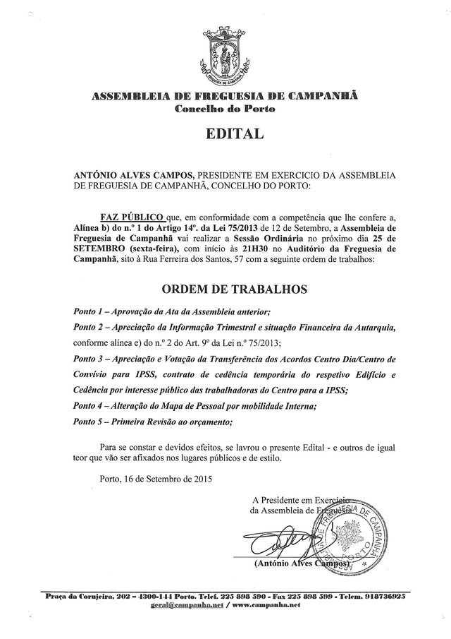 Informa-se a população que irá realizar-se a próxima sessão ordinária da Aessembleia de Freguesia no dia 25 de Setembro, a partir das 21h30, no Auditório da Freguesia de Campanhã, na Rua Ferreira dos Santos, 57.