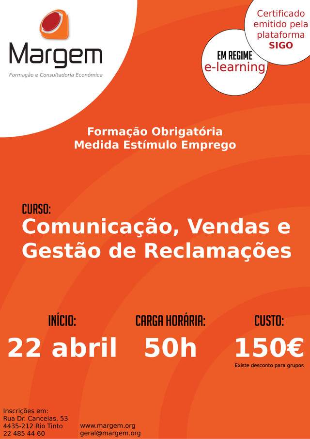 A Margem, uma empresa que já existe há 25 em Rio Tinto e que trabalha diariamente na área da formação tem agora disponível uma formação com a temática Comunicação, Vendas e Gestão de Reclamações, dedicada especialmente aos participantes da medida estímulo emprego – IEFP (Programa Estímulo).   As entidades que beneficiam deste programa comprometem-se a facultar ao colaborador 50 horas de formação. Assim, esta formação visa ajudar nessa mesma tarefa. De forma a tornar mais fácil conciliar o trabalho com a formação esta será feita em regime e-learning e tem um custo de 150€, havendo um desconto no caso de uma empresa inscrever um grupo. Para mais informações contactar, por favor, contatos indicados no cartaz.