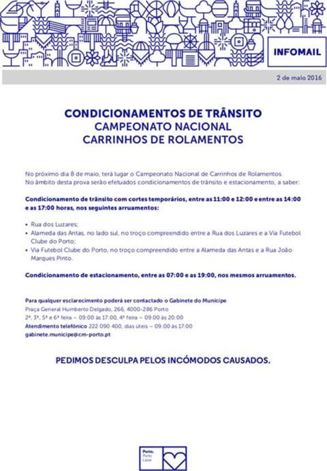 TRÂNSITO CONDICIONADO - CAMPEONATO CORRIDA ROLAMENTOS Vem aí o Campeonato Nacional de Carrinhos de Rolamentos, dia 08 de Maio, na Alameda do Dragão, desta forma o trânsito irá estar condicionado. 10º Aniversário RANGERS < Anterior Dia Nacional e Europeu de Obesidade - "Uma Responsabilidade de Todos!" Seguinte >