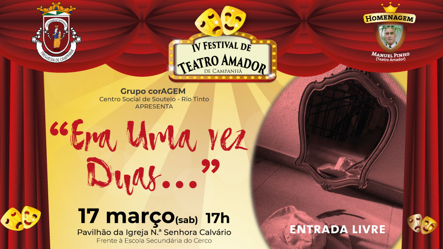 A Junta de Freguesia de Campanhã, vai levar a efeito mais uma Edição do Festival de Teatro Amador de Campanhã – Manuel Pinho. Por tal motivo, O Presidente da Junta de Freguesia de Campanhã, tem a Honra de convidar V.Excias, a estarem presentes no espetáculo inaugural da III Edição do Festival de Teatro Amador de Campanhã, no próximo dia 29 de Abril, às 21h30, no Auditório da Associação Nun’Alvares de Campanhã, sito na Rua do Falcão, n.º 555.