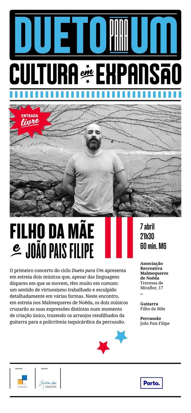 A Associação Recreativa Malmequeres de Noêda vão receber o Dueto Filho da Mãe e João País Filipe no âmbito da Cultura em Expansão, próximo dia 07 de Abril, a partir das 21h30. A entrada é livre.