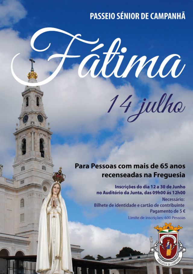 Passeio Sénior de Campanhã - Fátima Já estão abertas as inscrições no auditório de Campanhã. Festas em Honra do Padroeiro São Pedro < Anterior Assembleia de Freguesia - 27/Jun, 21H30 Seguinte >