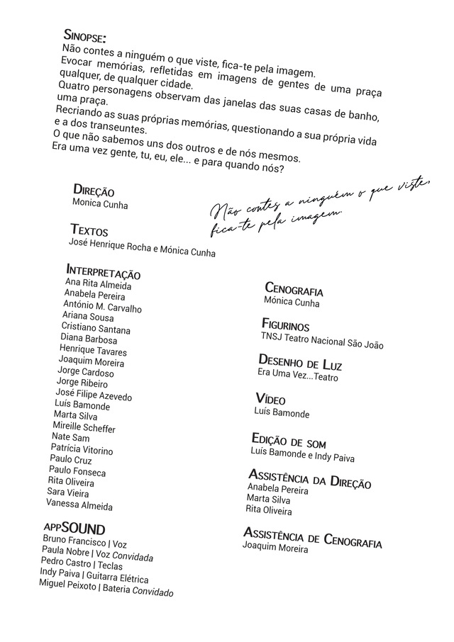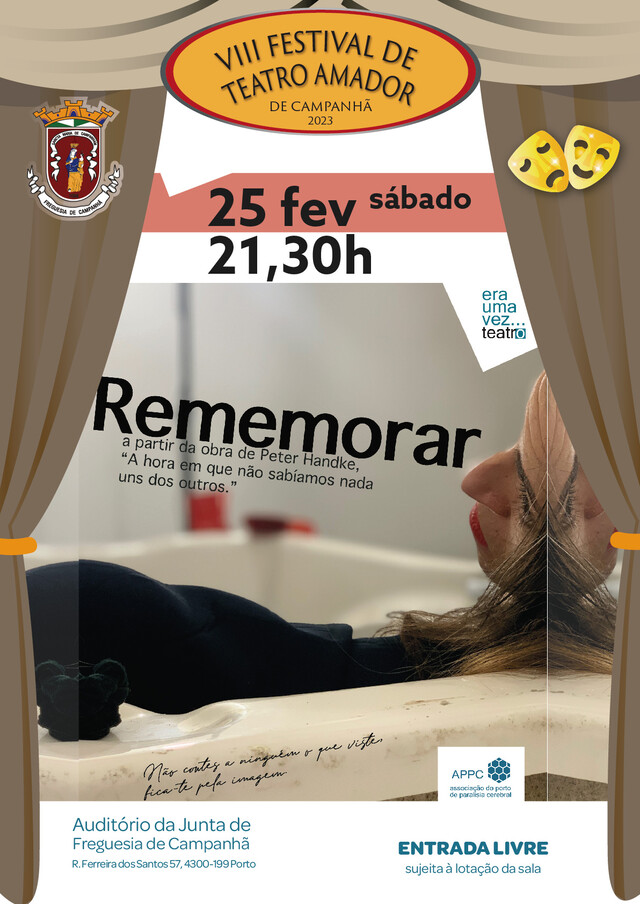 Convidado para a sessão inaugural, o Era Uma Vez... Teatro propõe-nos "Rememorar", com textos de José Henrique Rocha e Mónica Cunha a partir de A Hora em Que Não Sabíamos Nada Uns dos Outros do dramaturgo alemão Peter Handke: uma evocação e recriação de memórias, nossas e dos outros, como interpelação enquanto indivíduos e sociedade.