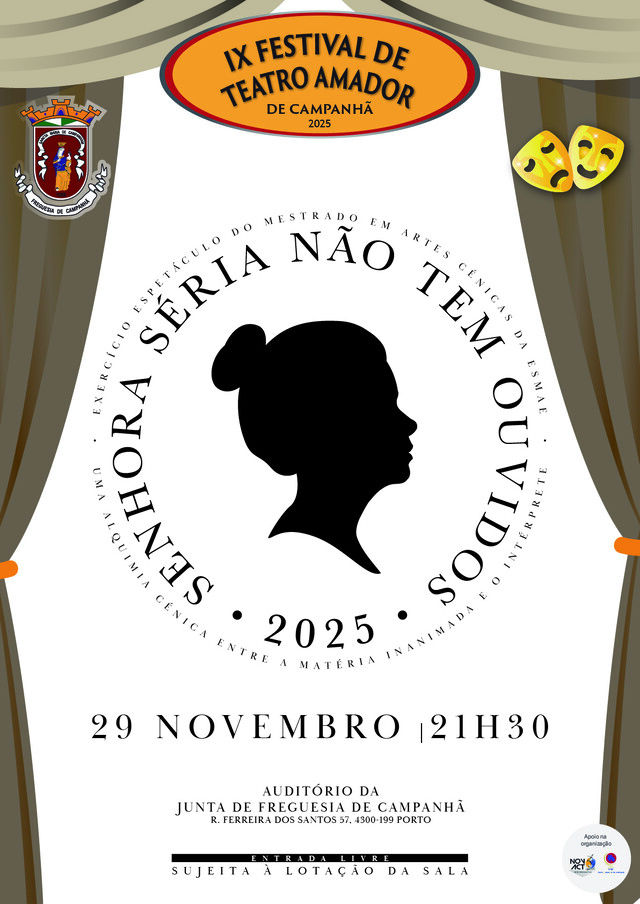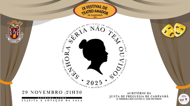O espetáculo "Senhora séria não tem ouvidos", será apresentado dia 29 de novembro, no auditório da junta de freguesia de Campanhã, pelas 21 horas e 30 minutos.