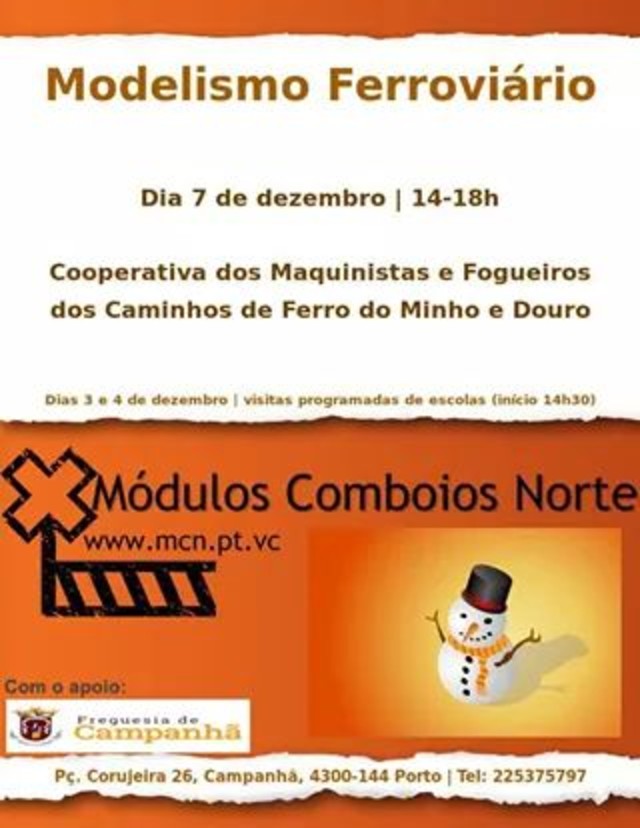 Exposição de Módulos de Comboios Uma exposição de miniaturas de Comboios vai estar patente nos proximos dias 07, 10 e 11 de Dezembro, das 14h30 as 18h, no edifício da Cooperativa dos Maquinistas e Fogueiros dos Caminhos de Ferro do Minho e Douro (à Praça da Corujeira).