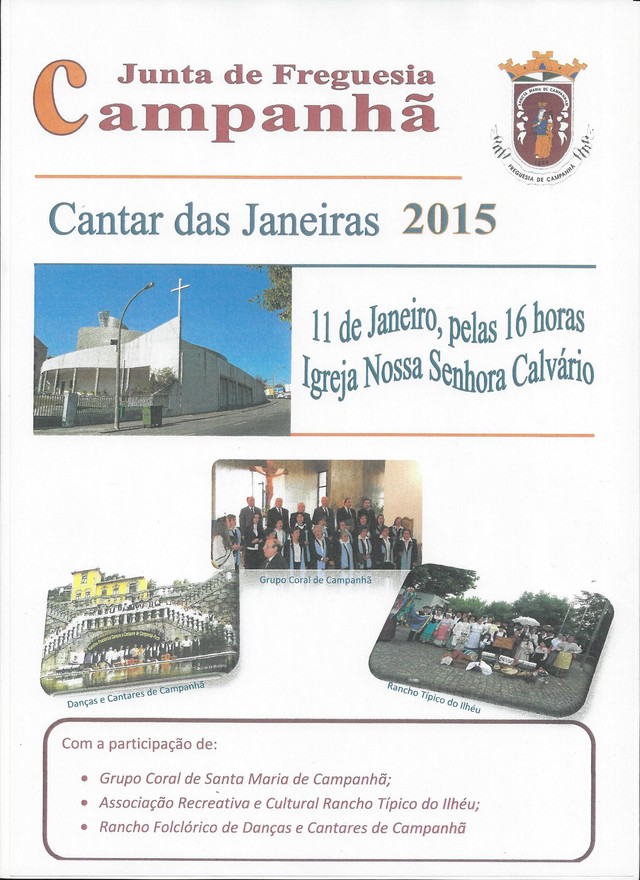 O tradicional Cantar as Janeiras vai realizar-sei mais uma vez, este ano na Igreja de Nossa Senhora do Calvário, às 16h. Vao participar neste evento o Grupo Coral de Santa Maria de Campanhã, o Rancho Folclórico de Danças e Cantares de Campanhã e a Associação Recreativa e Cultural Rancho Tipico do Ilhéu. MAIS FOTOS