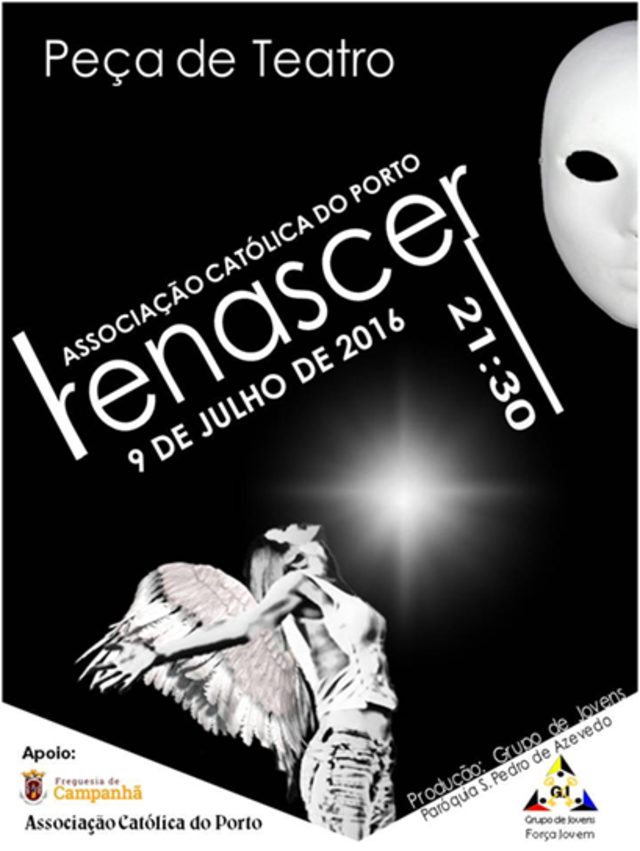 O Grupo de Jovens da Paróquia S. Pedro de Azevedo - Campanhã vai representar, pela segunda vez, a Peça de Teatro "Renascer ", desta vez na Associação Católica do Porto, no próximo dia 09 de Julho, às 21h30. A peça de teatro terá como objetivo a representação do cenário de guerra e miséria constante à nossa volta, que se vive nos dias de hoje e na nossa própria vida, e transpô-lo para a vida como cristãos jovens e adultos, fortes e capazes de o transformar através de obras de paz, amor e união. No fundo como o próprio nome da peça indica será o "Renascer" da humanidade. O convite é dirigido a todo o público, crianças, jovens e adultos que se interessem não só pelo teatro, mas também por um tema tão actual como o que é revelado nesta peça.