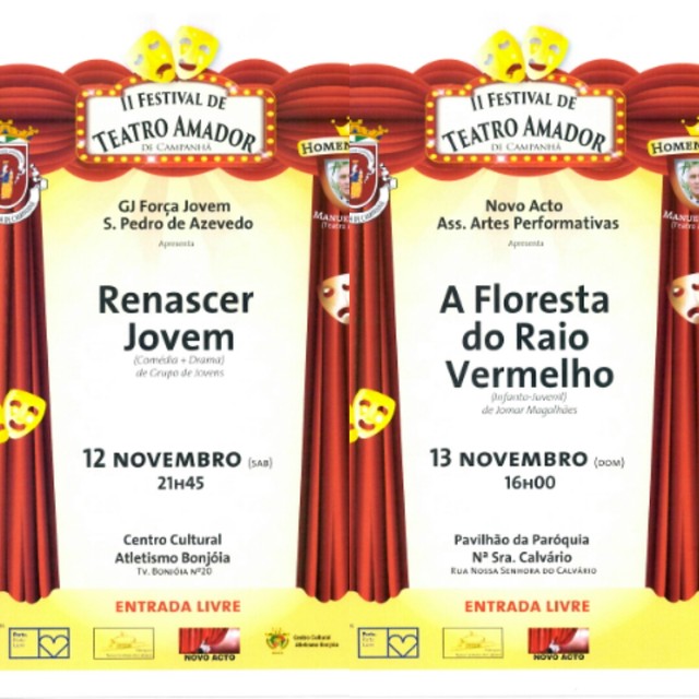 Próximo fim de semana, dias 12 e 13 de novembro, a 2a Edição do Festival de Teatro Amador de Campanhã vai continuar a percorrer as salas da Freguesia, desta vez paasam pelo Centro Cultural e Atletismo de Bonjóia, às 21h45 e pelo Pavilhão da Paróquia Na Sra. do Calvário, às 16h.