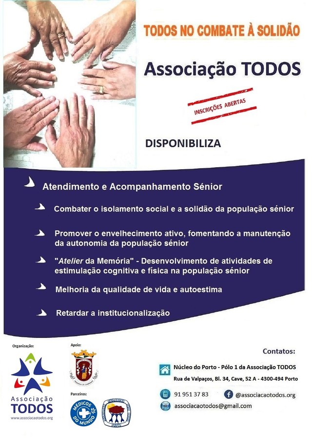 Esta inicitiva da Associação TODOS disponibiliza Atendimento e Acompanhamento Sénior para, nomedamente, Combater o isolamento social e a solidão da população sénior e Promover o envelhecimento ativo, fomentando a manutenção da autonomia da população sénior.