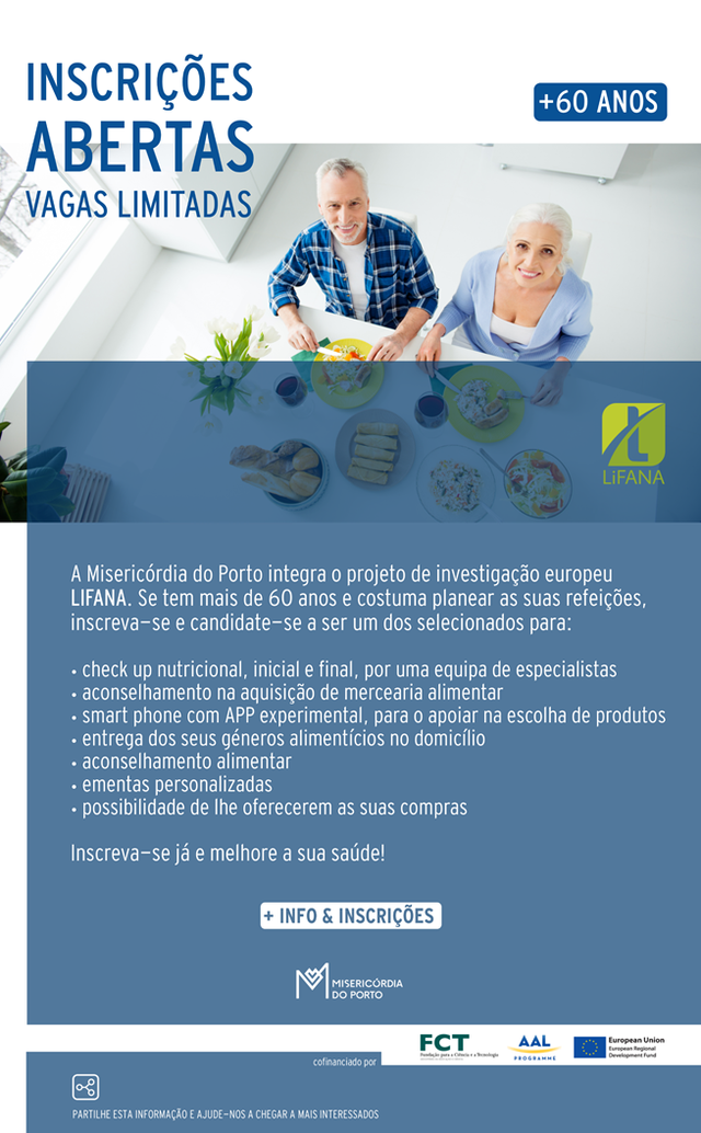 A Misericórdia do Porto integra o projeto de investigação internacional de nutrição saudável LIFANA, destinado à população com + de 60 anos, oferecendo benefícios gratuitos, durante os 12 meses de realização do field trial.