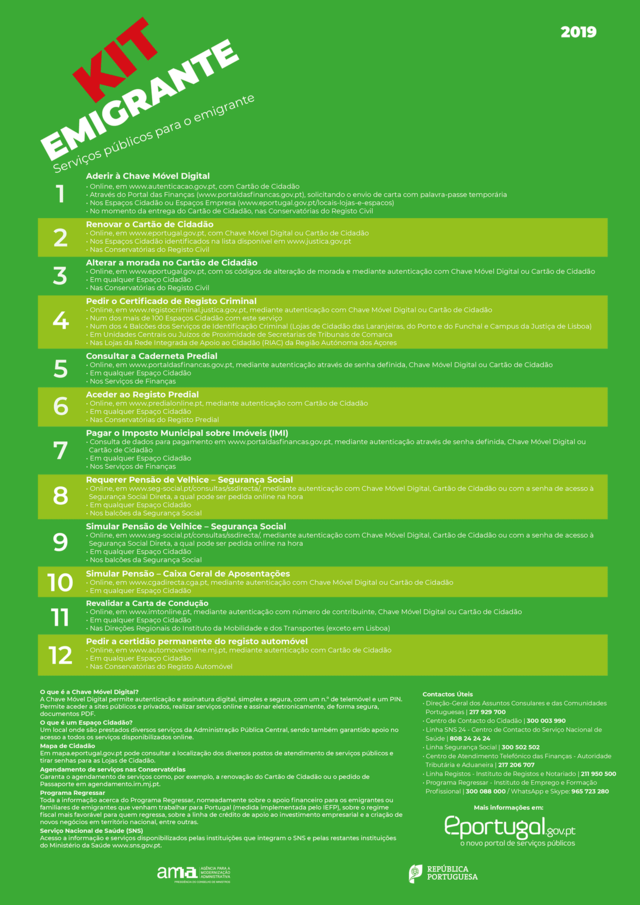 Para os ajudar, disponibiliza-se o "KIT Emigrante | Serviços Públicos para o Emigrante", que reúne informação de várias áreas de interesse e respetivos serviços públicos. O guia visa promover a divulgação, junto dos emigrantes portugueses que regressam agora a Portugal, dos meios mais simples, cómodos e céleres para aceder aos serviços públicos.