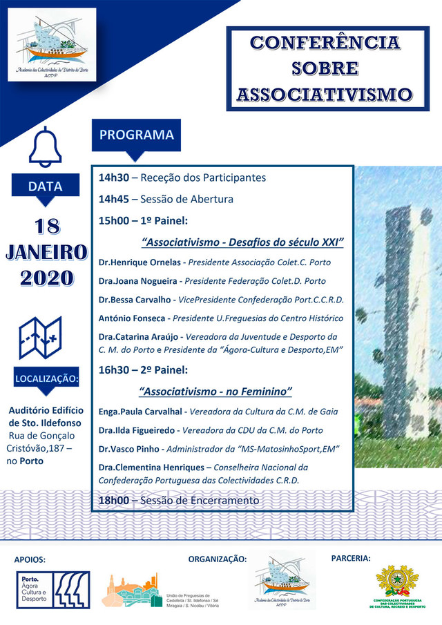 Vai decorrer no sábado 18 de janeiro de 2020 a “Conferência Sobre Associativismo” organizado pela Academia das Colectividades do Distrito do Porto. O evento decorrerá no Auditório Edifício de Sto. Ildefonso, na Rua de Gonçalo Cristóvão,187, na ciadde do Porto.