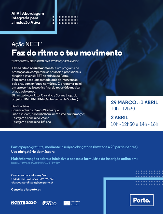 É uma iniciativa integrada no “Serviço NEET” - serviço-piloto de apoio ao desenvolvimento de projetos de vida de jovens em situação NEET, promovida pela Câmara Municipal do Porto através da Cidade das Profissões, no âmbito do Programa Integrado de Inovação e Experimentação Social e de Animação Territorial do Porto - Abordagem Integrada para a Inclusão Ativa (AIIA). Vai ser dinamizado por Artur Carvalho e Susana Lage, do Projeto TUM TUM TUM (Centro Social de Soutelo).