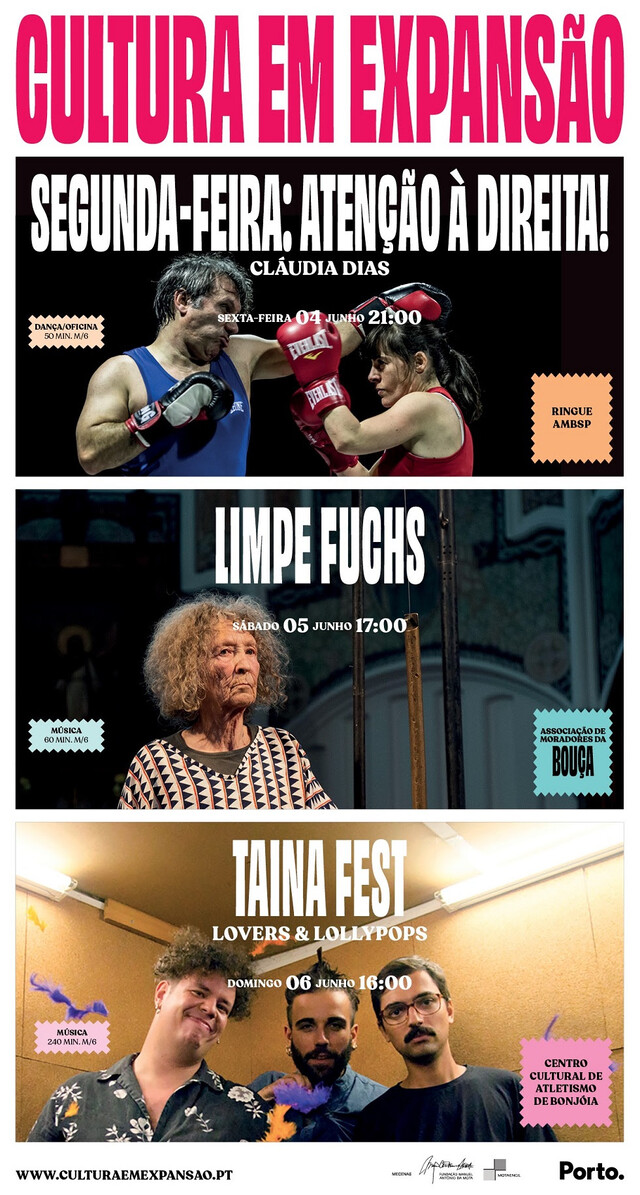 Um fim-de-semana de Cultura em Expansão, sexta-feira com o espetáculo "SEGUNDA-FEIRA: ATENÇÃO À DIREITA! | Cláudia Dias", ao qual se segue "LIMPE FUCHS", no sábado, e TAINA FEST | LOVERS & LOLLYPOPS no domingo em Bonjóia.