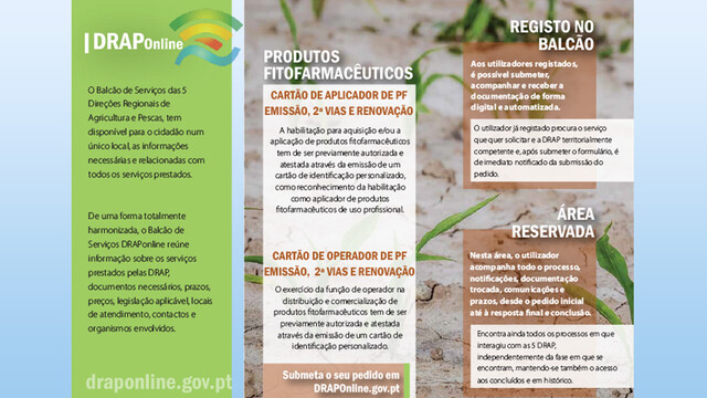 Nesta fase, o Balcão de Serviços DRAPonline?,disponibiliza um conjunto de serviços, designadamente, pedidos de emissão de cartão de aplicador de produtos fitofarmacêuticos, pedidos de emissão de cartão de operador de produtos fitofarmacêuticos, incluindo 2ªas vias ou renovações, e, ainda, uma funcionalidade que permite a submissão de pedidos de informação a qualquer DRAP.