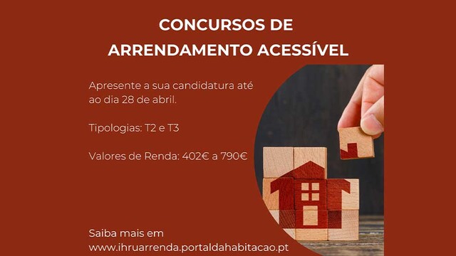 As inscrições estão abertas até ao dia 28 de abril e os interessados poderão encontrar toda a informação sobre este concurso em www.ihruarrenda.portaldahabitacao.pt.
