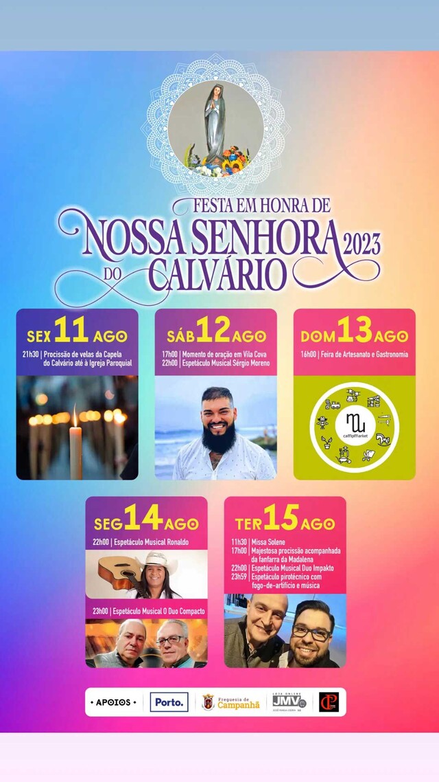 Este ano vão-se realizar mais uma vez as festas da Senhora do Calvário nos dias 11 a 15 de agosto. A festas começam com a tradcional procissão de velas e termina na grande festa no feriado 15 de agosto (terça-feira).
