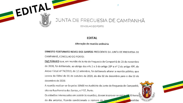 ERNESTO FORTUNATO NEVES DOS SANTOS PRESIDENTE DA JUNTA DE FREGUESIA DE CAMPANHÃ, CONCELHO DO PORTO: FAZ PÚBLICO que, em reunião da Junta de Freguesia de Campanhã de 25 de novembro de 2020, foi deliberado, ao abrigo dos n2s 2 e 3 do artigo 202 e n2 2 do artigo 492, do Anexo 1 à Lei n2 74/2013, de 12 setembro, foi deliberado alterar a reunião pública, que consta do Edital de 01 de outubro de 2020, do dia 02 de dezembro para o dia 03 de dezembro de 2020. A reunião realizar-se-ão pelas 18h00 no Auditório da Junta de Freguesia de Campanhã, sito na Rua Ferreira dos Santos, n.2 57, Porto.