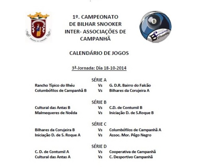 Hoje, 17/10/2014, 21h30 3a Jornada Bilhar Antecipada a 3a Jornada do Campeonato de Bilhar / Snooker .Hoje 21h30 na Associacao do Ilhéu e nas Galerias de S. Roque.