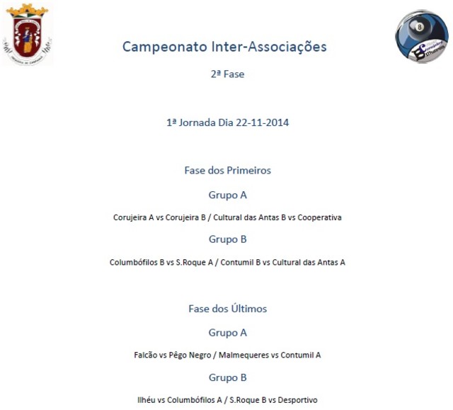 2a Fase de Grupos Campeonato de Bilhar / Snooker É ja no dia 22 de Novembro, próximo sabado, que arranca a 2a Fase de Grupos do Campeonato Inter-Associaçoes de Bilhar / Snooker.