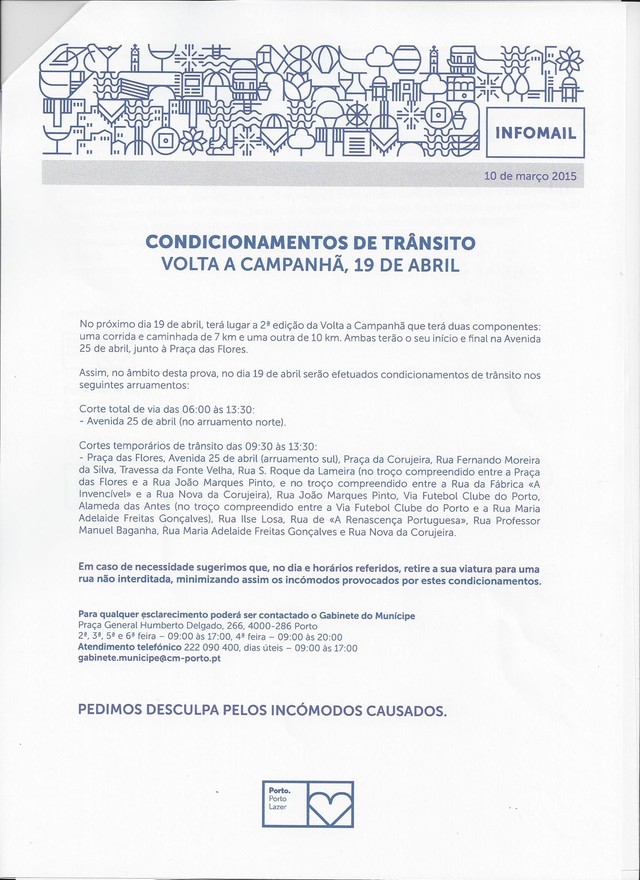 VOLTA A CAMPANHÃ - trânsito condicionado No dia 19 de Abril vai decorrer a Volta a Campanhã com partida e chegada da Av. 25 de Abril, às 10h30. O trânsito vai estar condicionado de acordo com cartaz. A CORRER E A CAMINHAR -VOLTA A CAMPANHÃ - 2a Edição < Anterior ANTISTRESS - 26-04-2015 Seguinte >