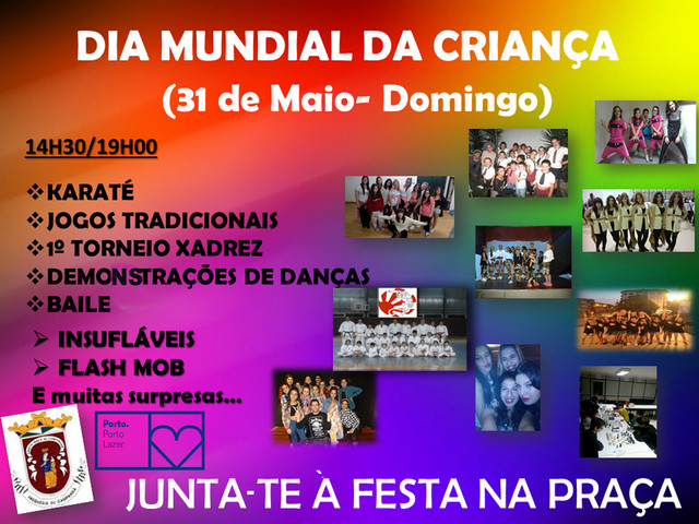 O Dia Mundial da Criança em Campanhã vai ser celebrado no domingo (31/05) a partir das 14h, com muita Animação e Surpresas, onde além das crianças os adultos vão de certeza divertir-se muito. Neste mesmo dia vai realizar-se o 1o Torneio de Xadrez na Praça (Praça da Corujeira).