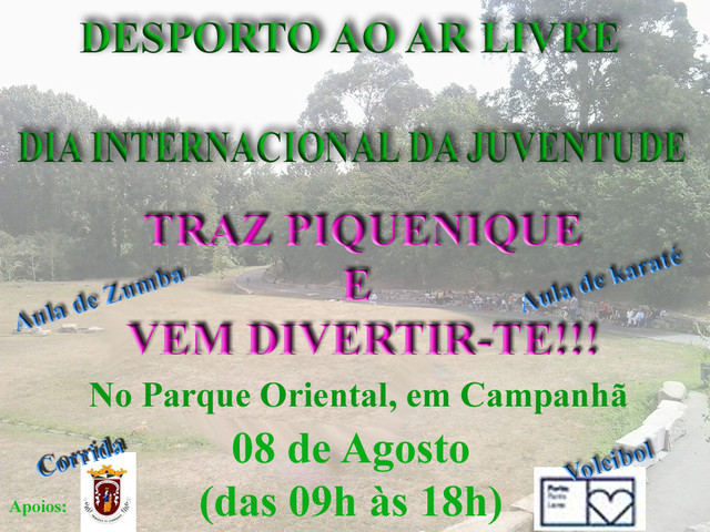 DIA INTERNACIONAL DA JUVENTUDE No próximo sábado, 08 de Agosto, comemora-se o Dia Internacional da Juventude, (embora o dia oficial seja a 12 de Agosto), no Parque Oriental de Campanhã, com várias actividades desportivas. Das 09h até às 18h, leva piquenique e diverte-te. VETERANOS CAMPEÕES EM NICE < Anterior EM JULHO - PORTO ANTI STRESS Seguinte >