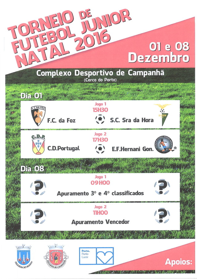 TORNEIO DE FUTEBOL JUNIOR DE NATAL O Complexo Desportivo de Campanhã, no dia 01 de Dezembro vai receber o Torneio de Futebol Júnior de Natal. O apuramento de 3o e 4o classificados e final jogam-se no dia 08 de Dezembro. ESTÁGIO NACIONAL DE INVERNO DE KARATÉ DO CPK VAI SER EM CAMPANHÃ < Anterior RESULTADOS DA 1a JORNADA DO CAMPEONATO DE BILHAR INTER-ASSOCIAÇÕES DE... Seguinte >
