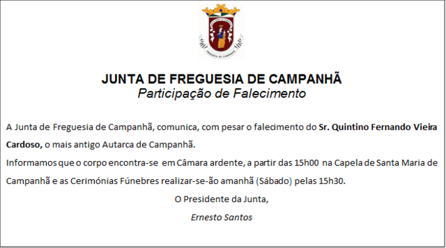 A Junta de Freguesia de Campanhã, comunica, com pesar o falecimento do Sr. Quintino Fernando Vieira Cardoso, o mais antigo Autarca de Campanhã.