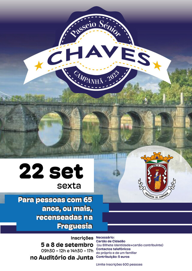 Vamos realizar mais uma edição do passeio Sénior para os Campanhenses. Neste ano de 2023 vai-se a realizar dia 22 de setembro e será desta feita a Chaves esta cidade única das terras do Alto Tâmega e Trás-os-Montes..