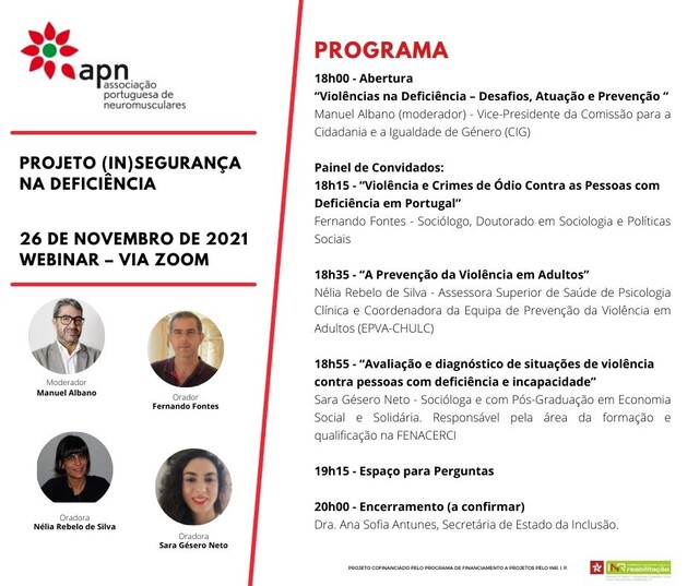 A Associação Portuguesa de Neuromusculares (APN) está a promover um ciclo de sessões online, dedicadas à prevenção de fenómenos de violência na deficiência. O quarto webinar é subordinado ao tema Violências na Deficiência – Desafios, Atuação e Prevenção”e vai realizar-se no dia 26 de novembro, pelas 18h00.