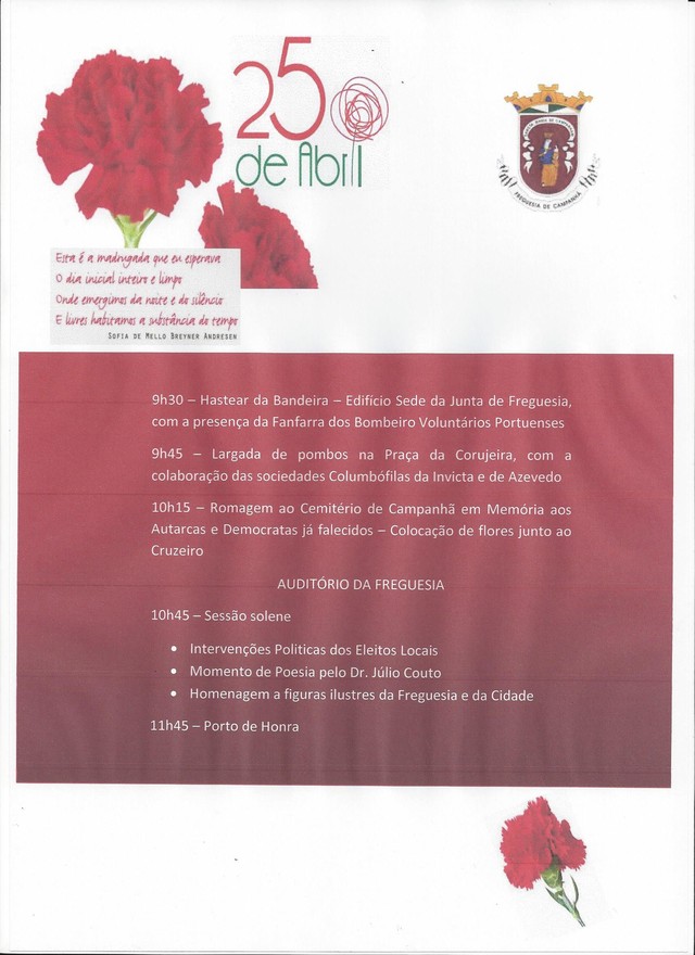 Na Freguesia de Campanhã o 25 de Abril comemora-se com ênfase para entidades e personalidades que se destacaram nesta freguesia. A população está convidada a comparacer no átrio do Edifício da Junta, onde se inicião as celebrações, às 9:30, com o hastear da bandeira e a tradicional largada de pombos. Segue-se a romagem ao cemitério onde são recordados e homenageados autarcas e democratas já falecidos. A encerrar estas celebrações, no Auditório da freguesia realiza-se uma Sessão Solene, com intervenções políticas, momento de poesia pelo Dr. Júlio Couto e homenagem a personalidades ilustres da Freguesia e da cidade, seguido de um Porto de Honra.