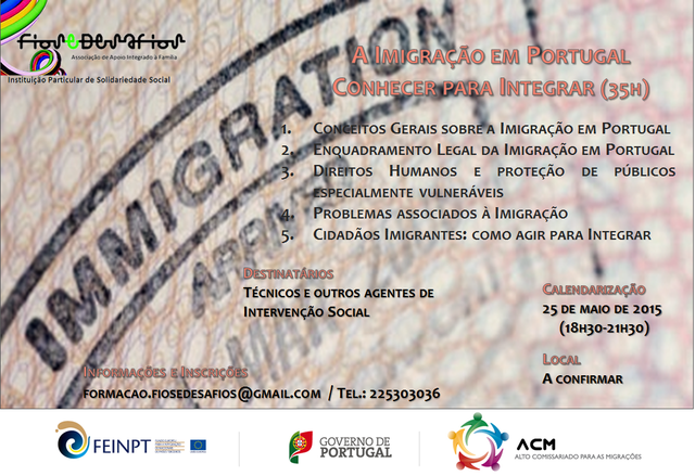 A Fios e Desafios - Associação de Apoio Integrado à Família promoverá, no âmbito do Projeto Integra - Ação 5 - PA2013 do FEINPT, a ação de formação " A Imigração em Portugal: Conhecer para Integrar"(35h), dirigida a técnicos e outros agentes de intervenção social que trabalham direta ou indiretamente com individuos e/ou famílias imigrantes.A formação é gratuita, mas de inscrição obrigatória e número de vagas limitado.