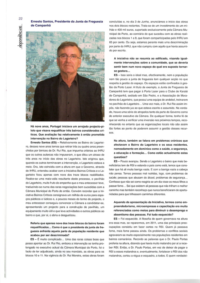 O Presidente da Junta de Freguesia, Ernesto Santos, deu uma entrevista à revista "Dependências" acerca dos bairros críticos. Para ler notícia completa clique no link: http://www.dependencias.pt/detalhe-noticia.php?id=689